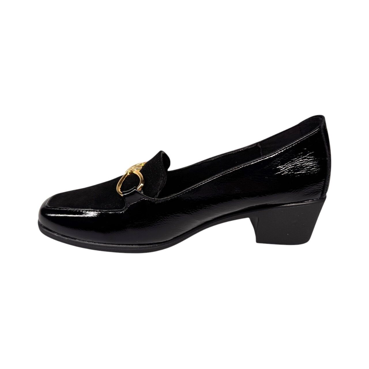 Κομψό και διαχρονικό, αυτό το παπούτσι από μαύρο λουστρίνι συνδυάζει την κλασική αισθητική με μια διακριτική πινελιά πολυτέλειας. Η μεταλλική αγκράφα στο επάνω μέρος προσθέτει θηλυκότητα και στιλ, ενώ η μαλακή εσωτερική επένδυση και το σταθερό χαμηλό τακούνι εξασφαλίζουν άνεση σε κάθε βήμα. Ένα elegant σχέδιο που μπορεί να φορεθεί από το πρωί έως το βράδυ, στο γραφείο ή σε ιδιαίτερες περιστάσεις.