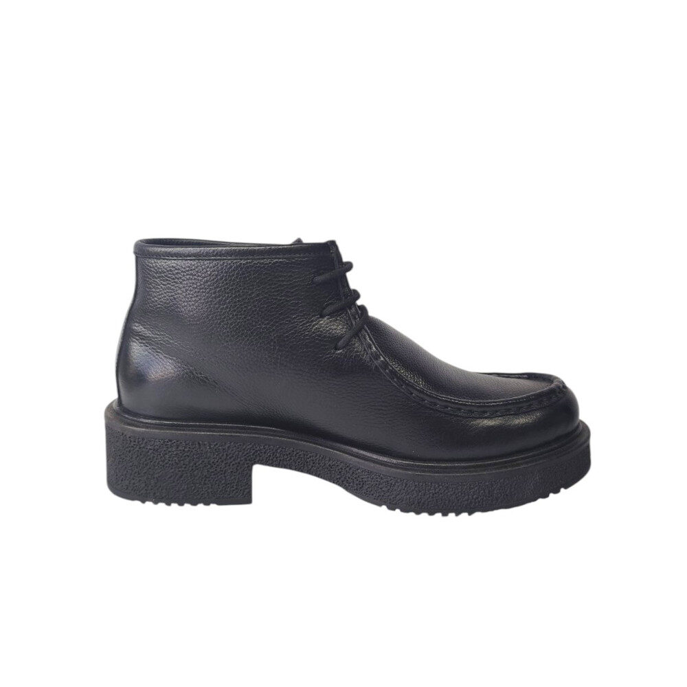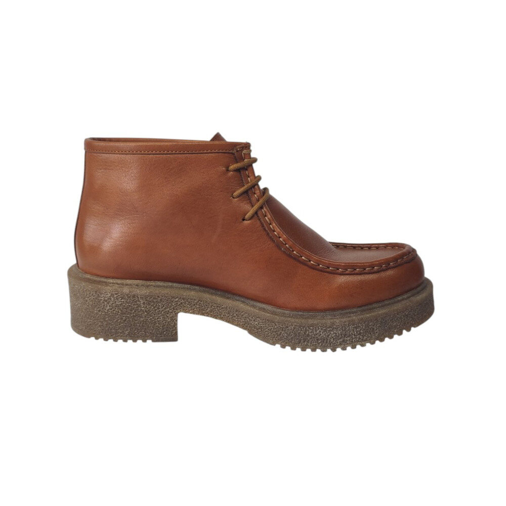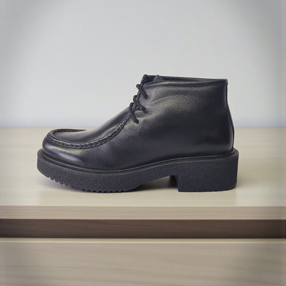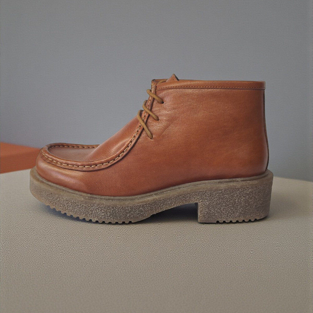 Γυναικείο μποτάκι από γνήσιο δέρμα με ραφές χειροποίητου στυλ και minimal σχεδιασμό. Η ανθεκτική σόλα τύπου crepe προσφέρει σταθερό πάτημα και φυσική άνεση, ενώ το δετό κλείσιμο εξασφαλίζει άψογη εφαρμογή.